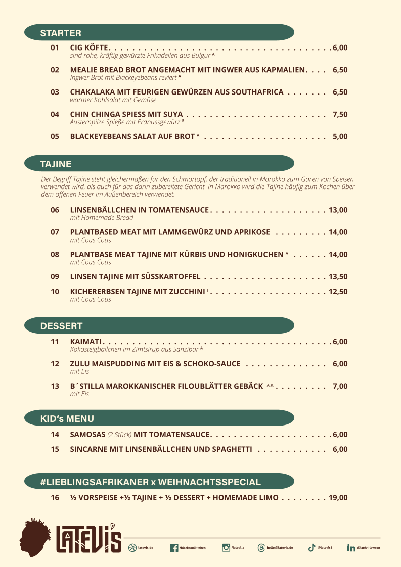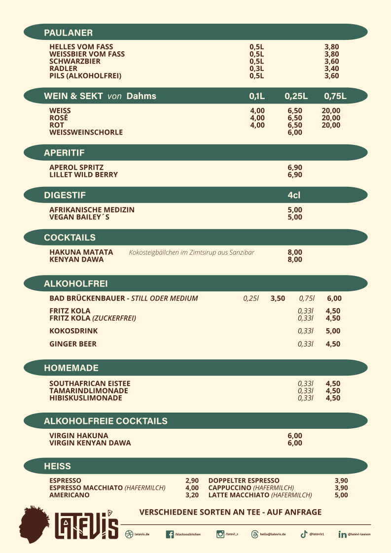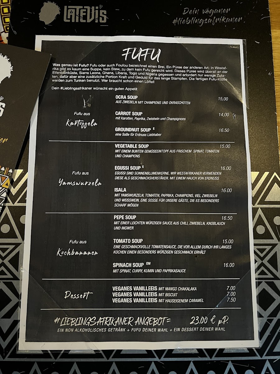 Welcome to LATEVI‘S, a culinary gem nestled in Schweinfurt, Germany. This vibrant eatery serves an exciting array of dishes that artfully blend vegan and West African flavors, offering a unique crossover kitchen experience. Brace yourself for an unforgettable taste journey with highlights like the chicken groundnut stew, paired with an exquisite peanut butter sauce and roasted cauliflower. The feedback from our diners speaks volumes: a delightful atmosphere combined with friendly service makes each visit memorable.